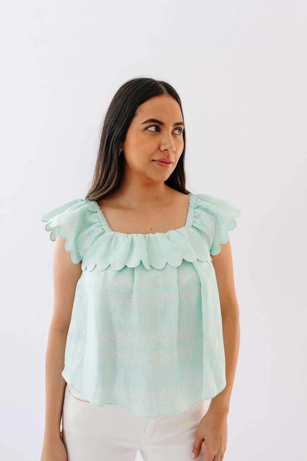 The Quinn Top is a charming blend of elegance and ease, crafted from our signature silk linen fabric for a lightweight feel with a hint of luster. Delicate scallop detailing along the neckline and hem adds a feminine touch, making this top just as beautiful on its own as it is paired with our Kate Short. Whether you're dressing it up for a warm-weather outing or keeping it casual, the Quinn Top is a versatile staple you'll reach for again and again.