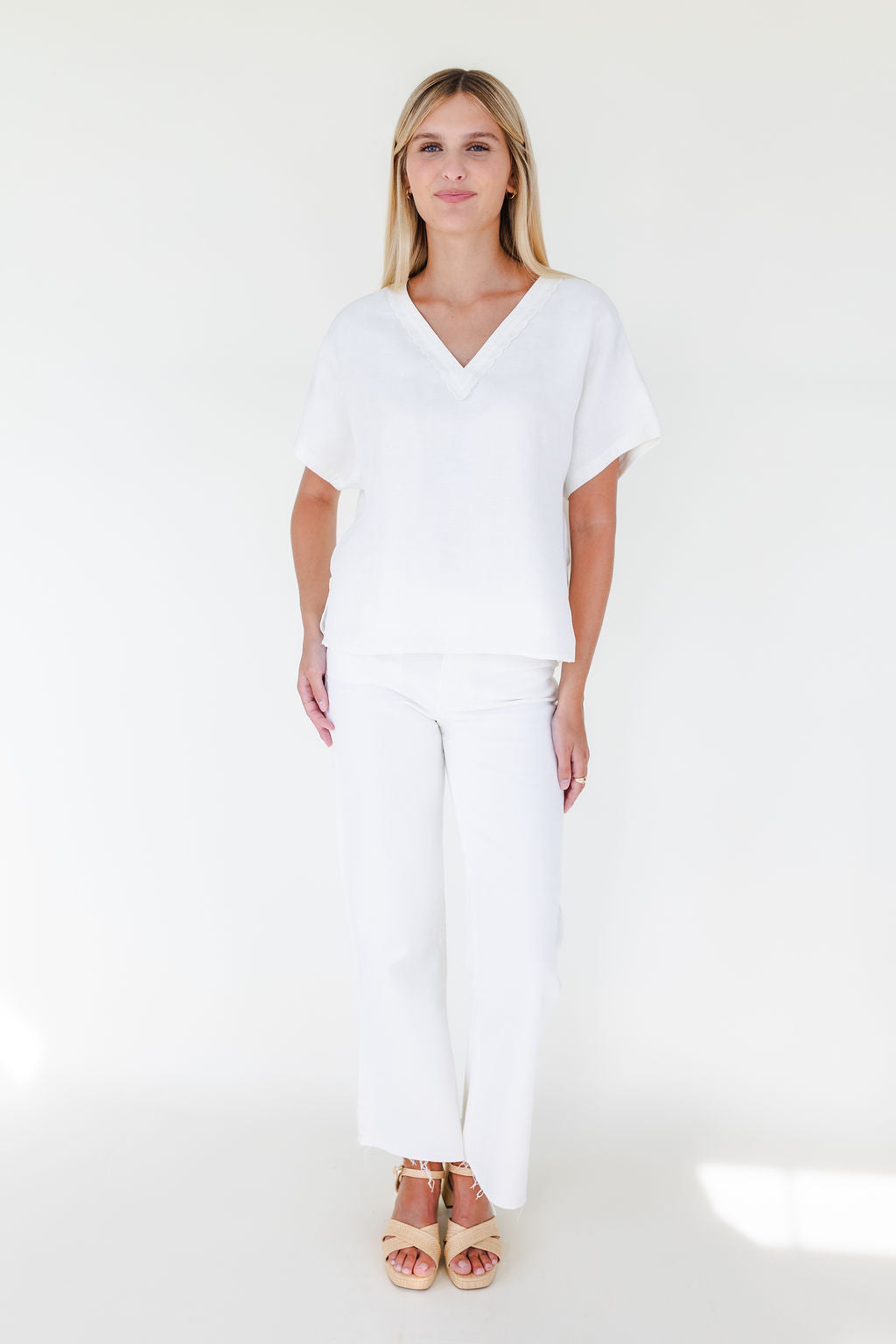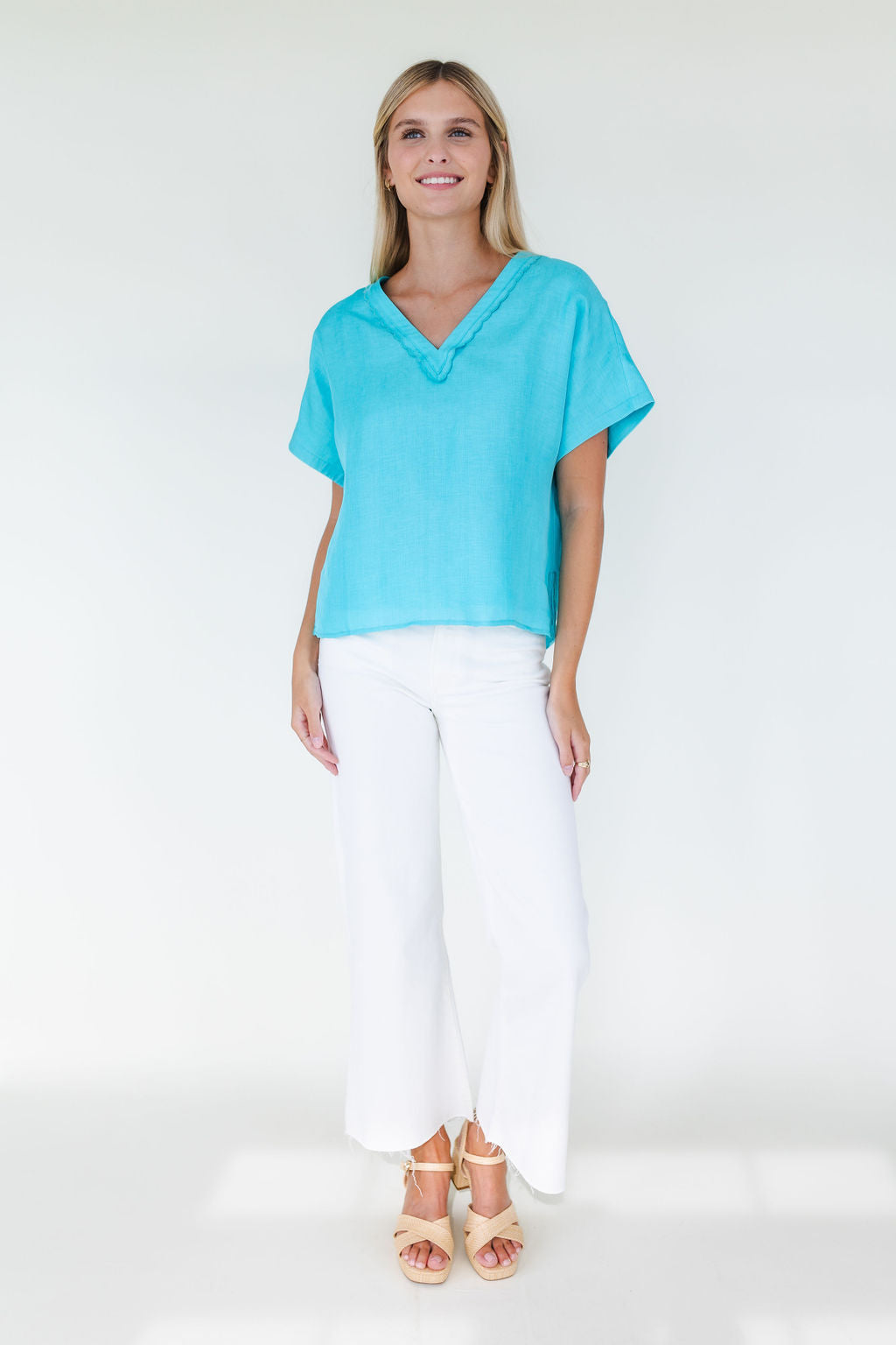 Silk linen top with scallop detail around trim. Sample size small. Worn for shoot and shown at market. Final sale.